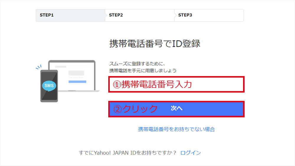 携帯電話番号を入力したら、「次へ」をクリックします。