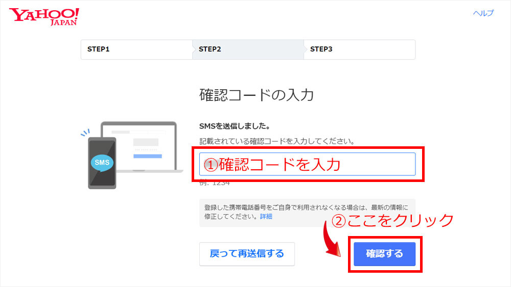 携帯のショートメール(SMS)に届いた確認コード(4桁の数字)を入力して「確認する」をクリックします。
