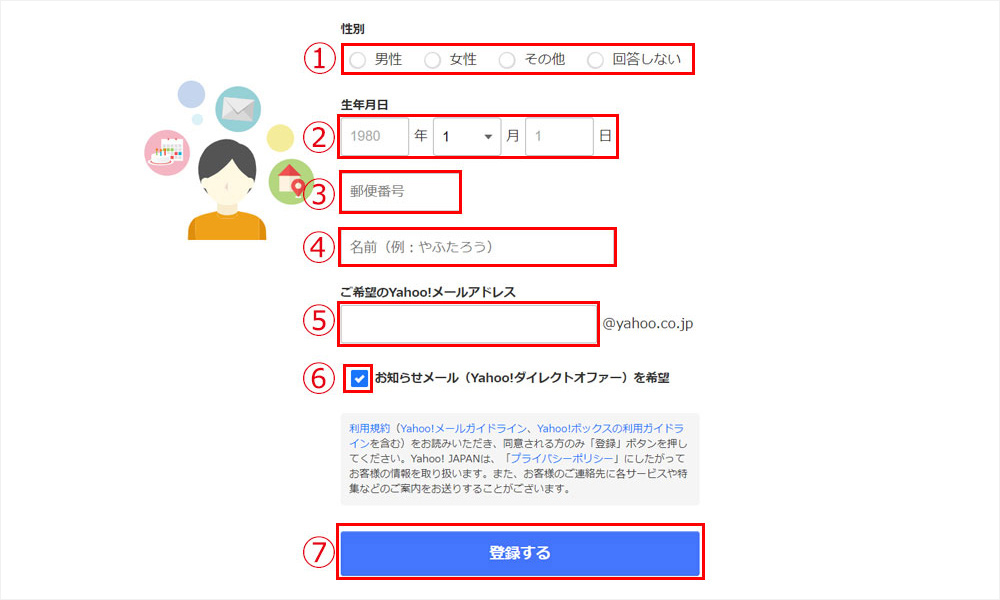 - 「登録する」をクリックすると、ご自分のヤフーメールアドレスが作成されます。