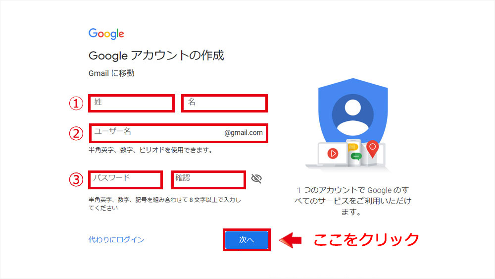 - ユーザー名を入力します。これはアドレスの@の左部分になりますので、自由に半角英数字で入力してください。